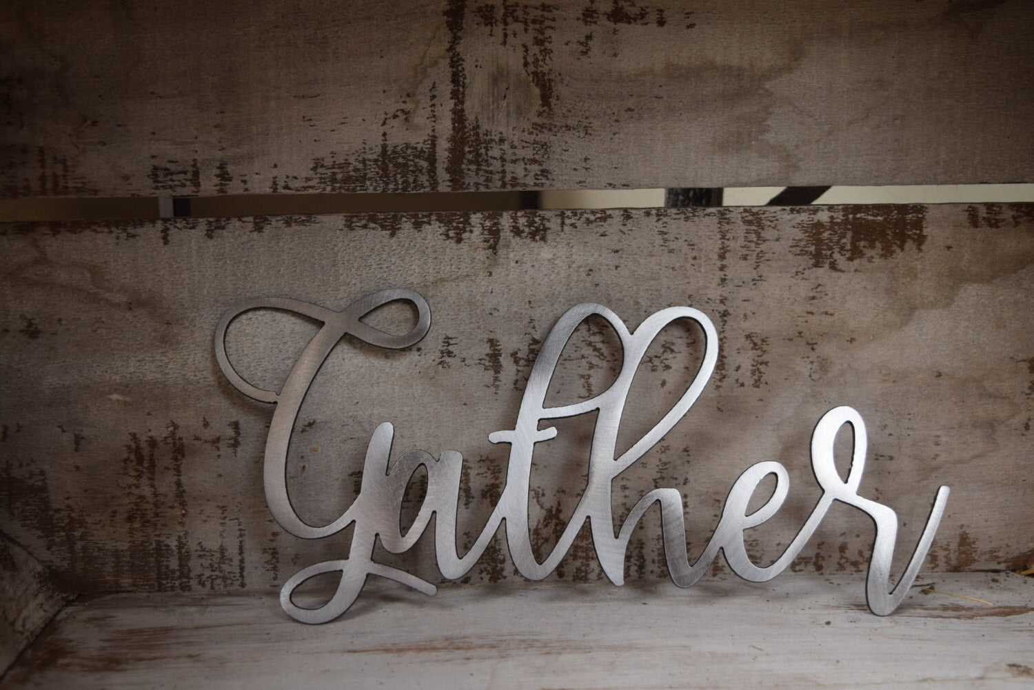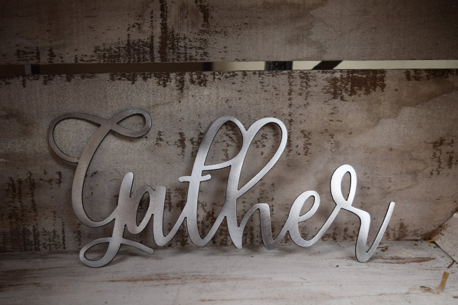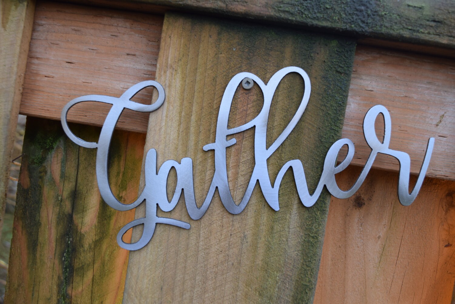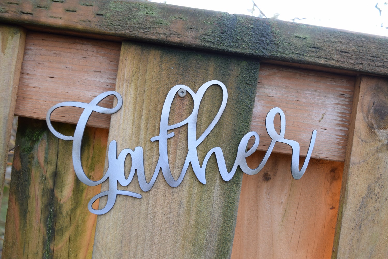 Your "Gather" sign can be left uncoated for you to apply your own finish or we can paint or rust it for an additional fee.