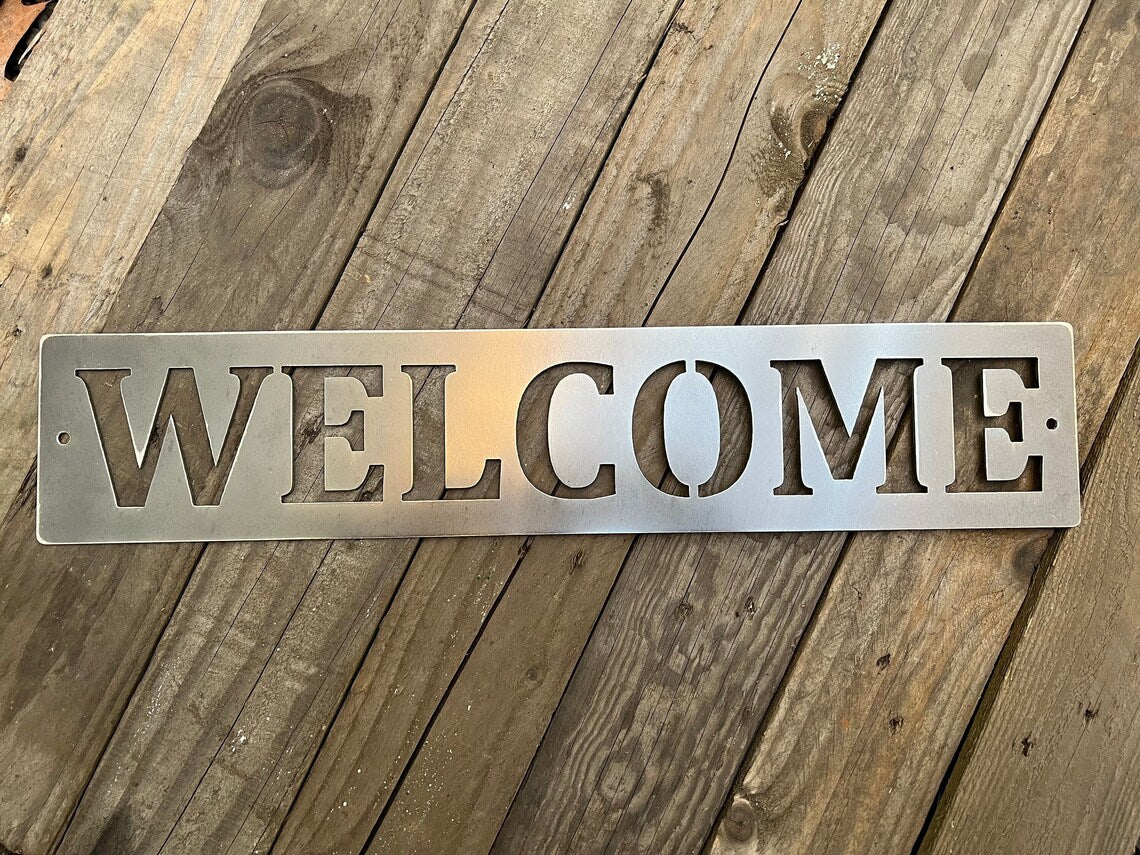 • This is a custom metal "Welcome" sign. It has pre-cut holes for easy installation and made from steel.