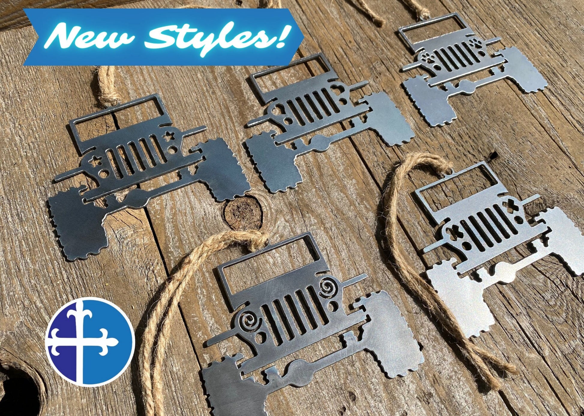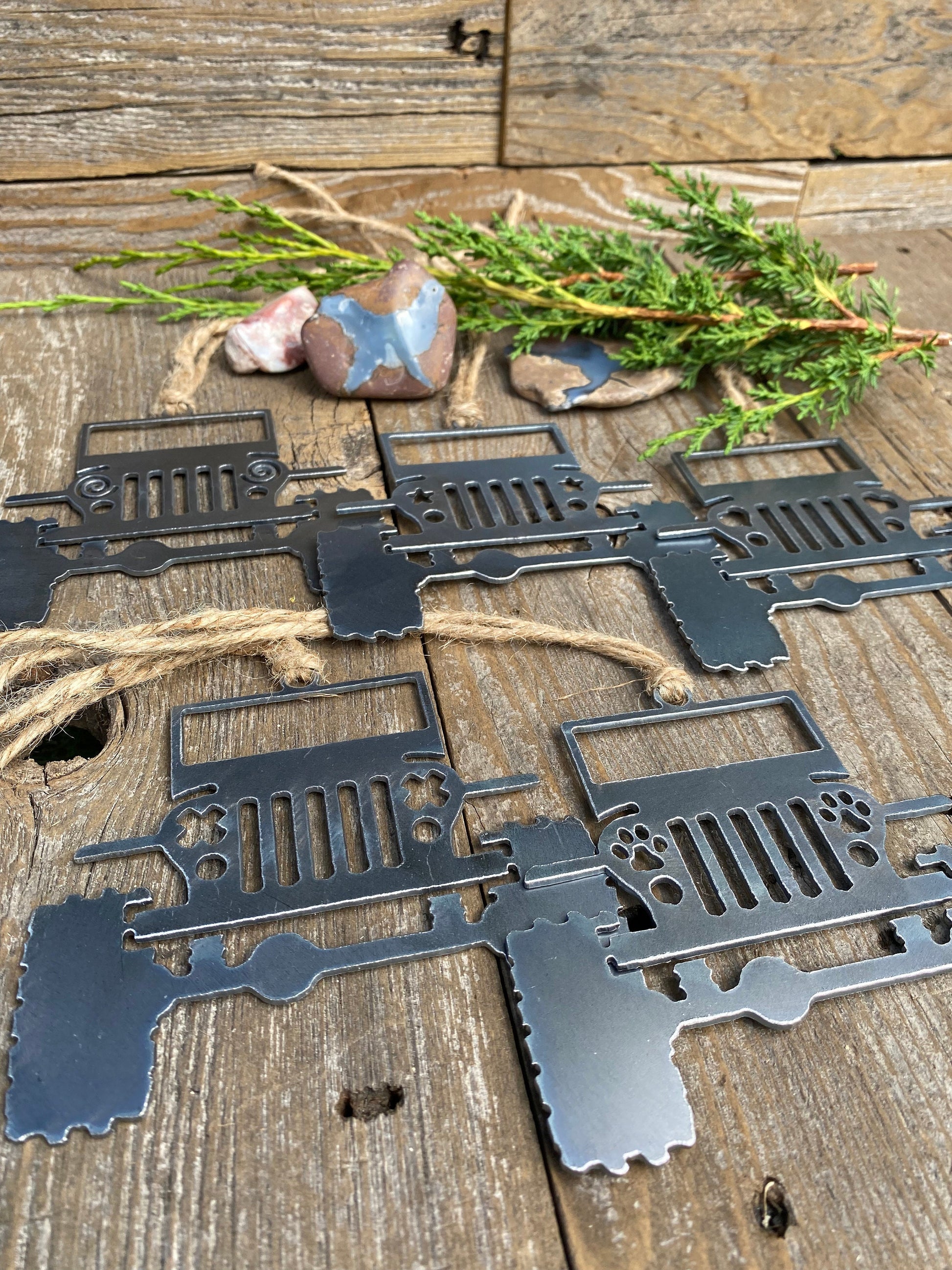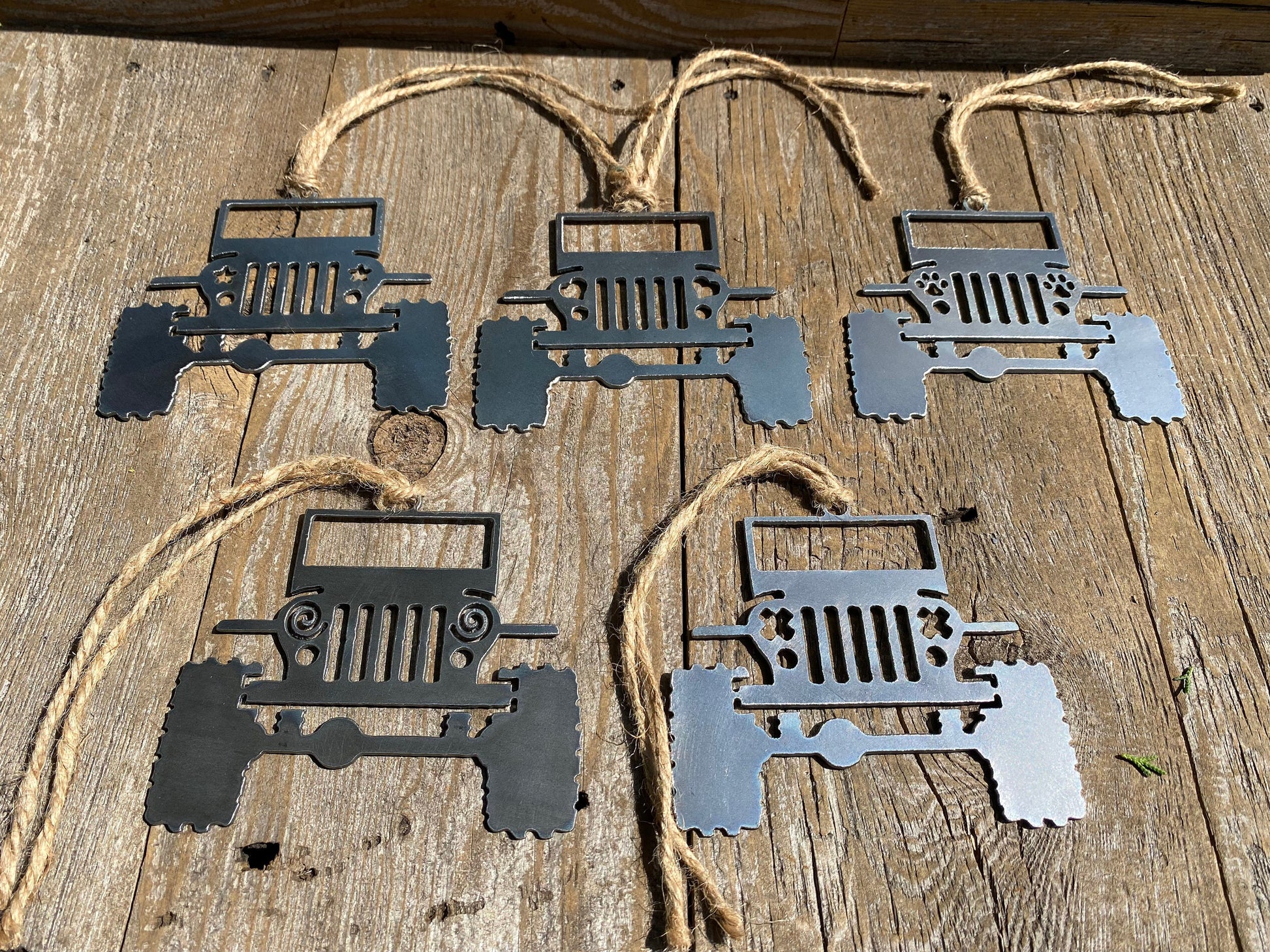 1 Jeep Ornament approximately 4" H x 4.5" W. The ornament will include ribbon/twine to hang. May vary in color or style from what is shown in the pictures.