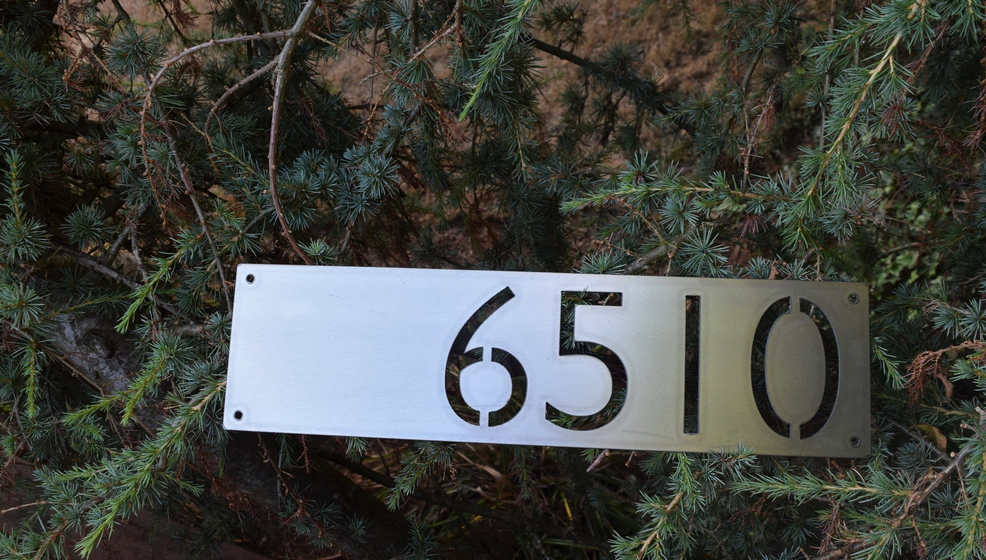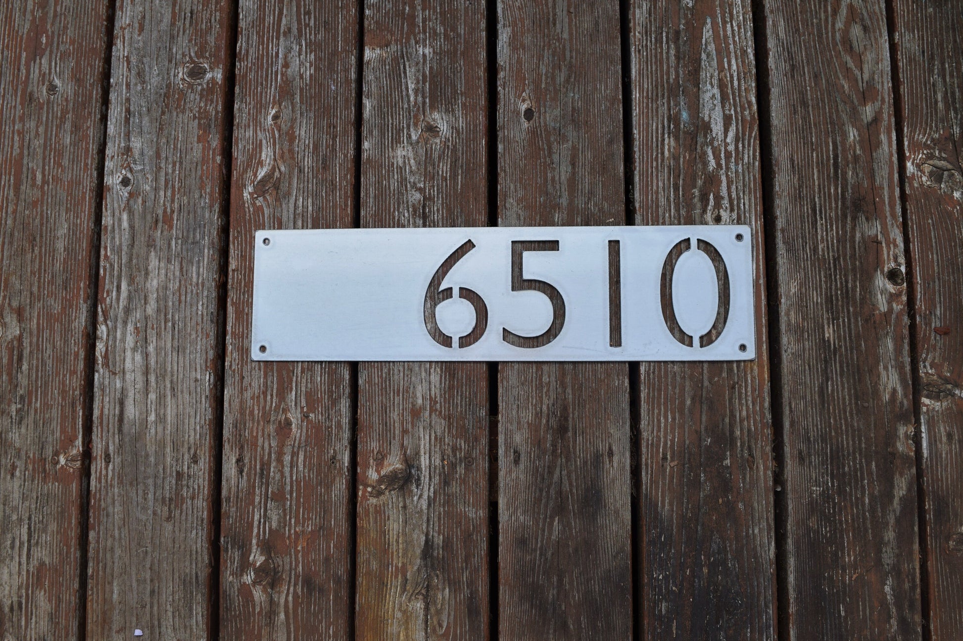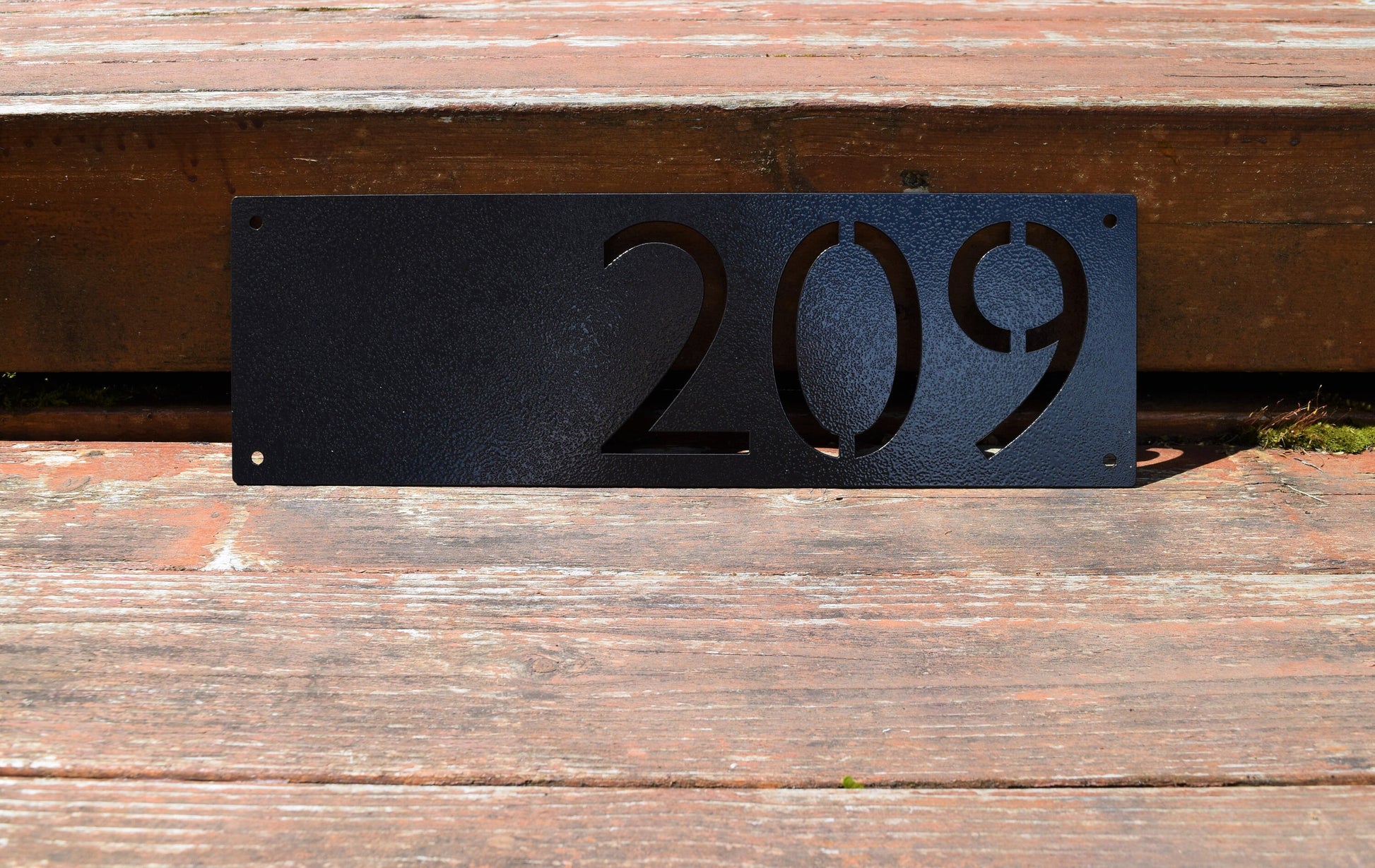 • This is a custom metal address sign. It has pre-cut holes for easy installation and is made from steel. This product is personalized with your own house number and will make a great addition to any front porch or mailbox.