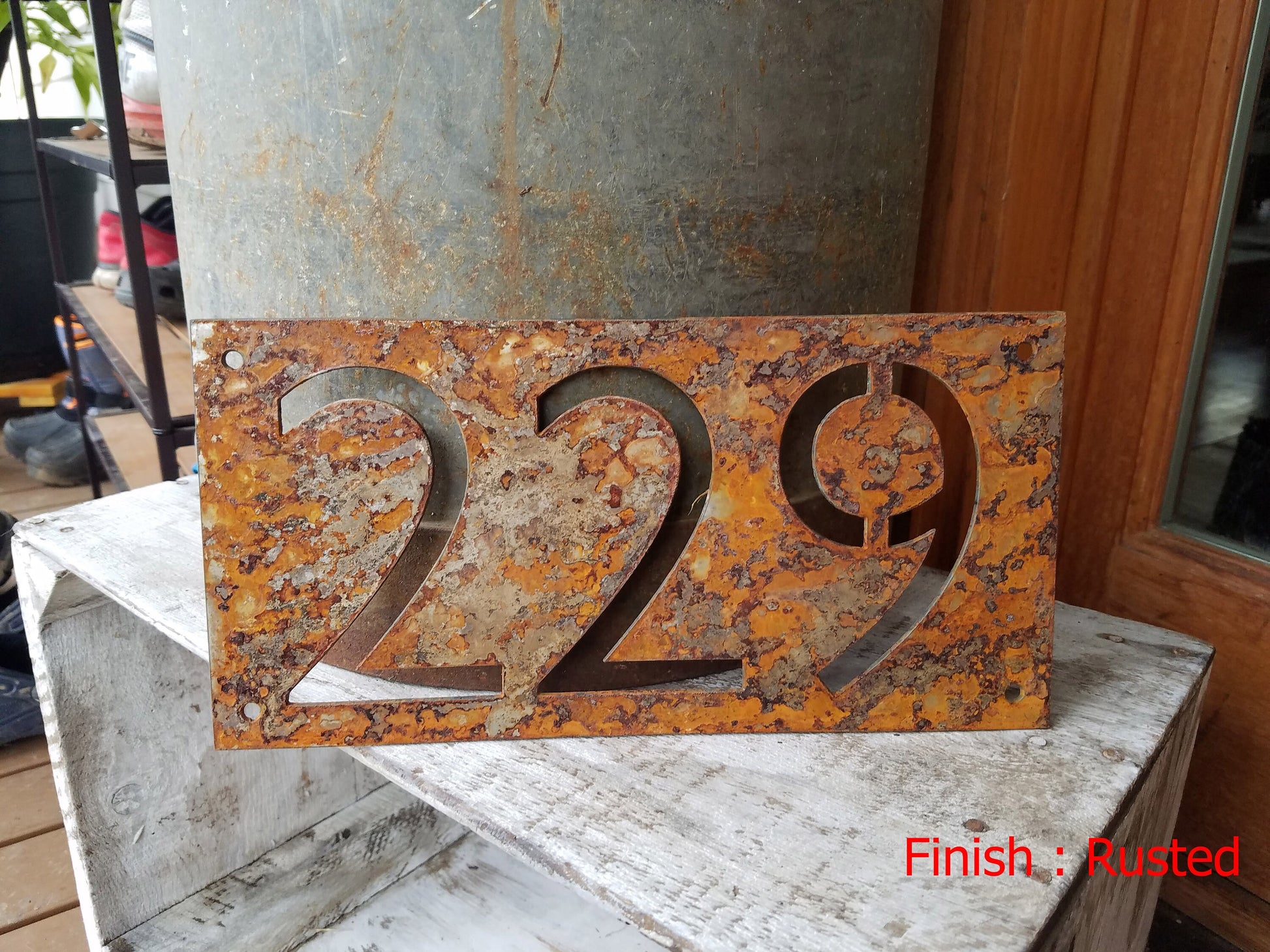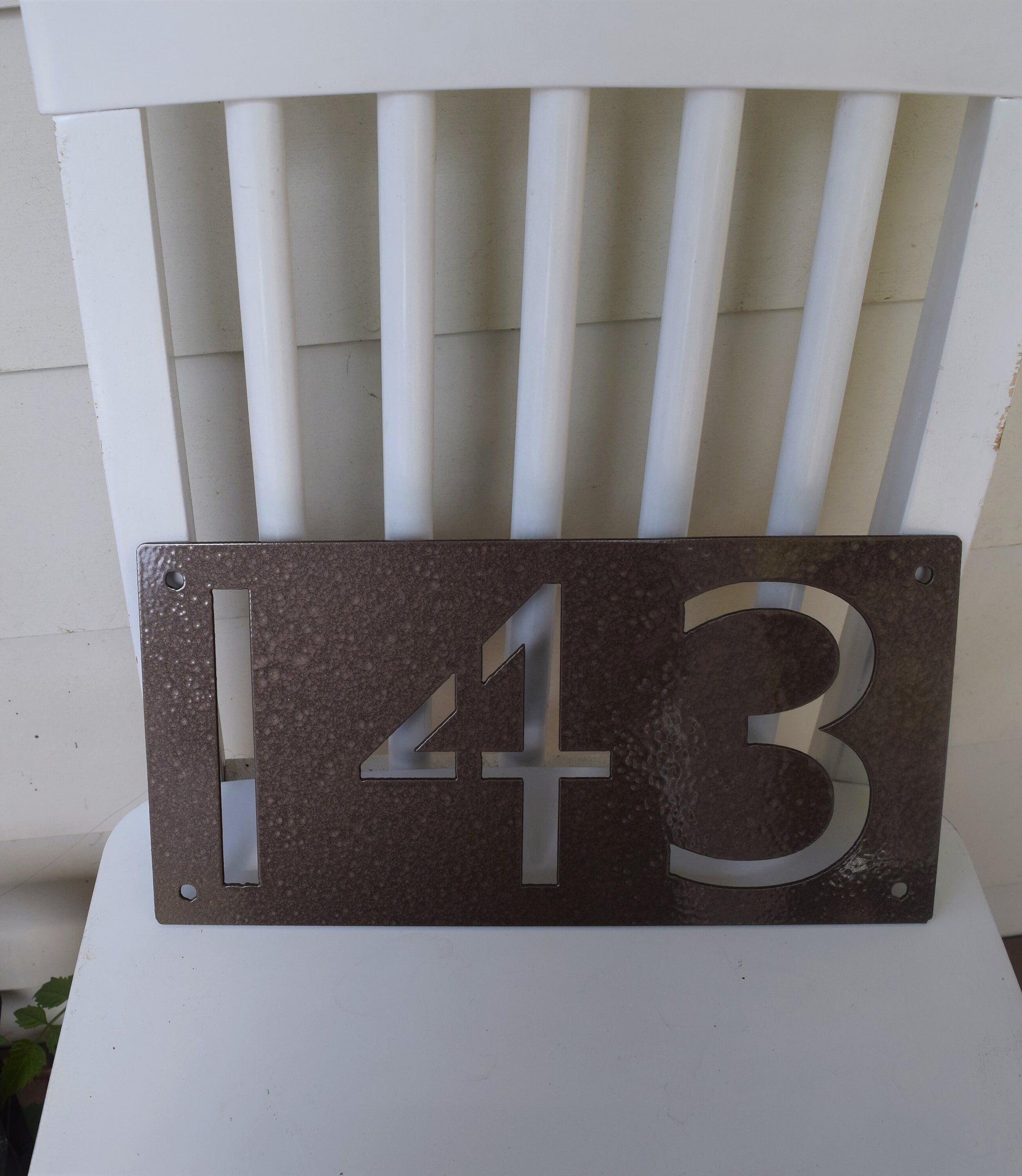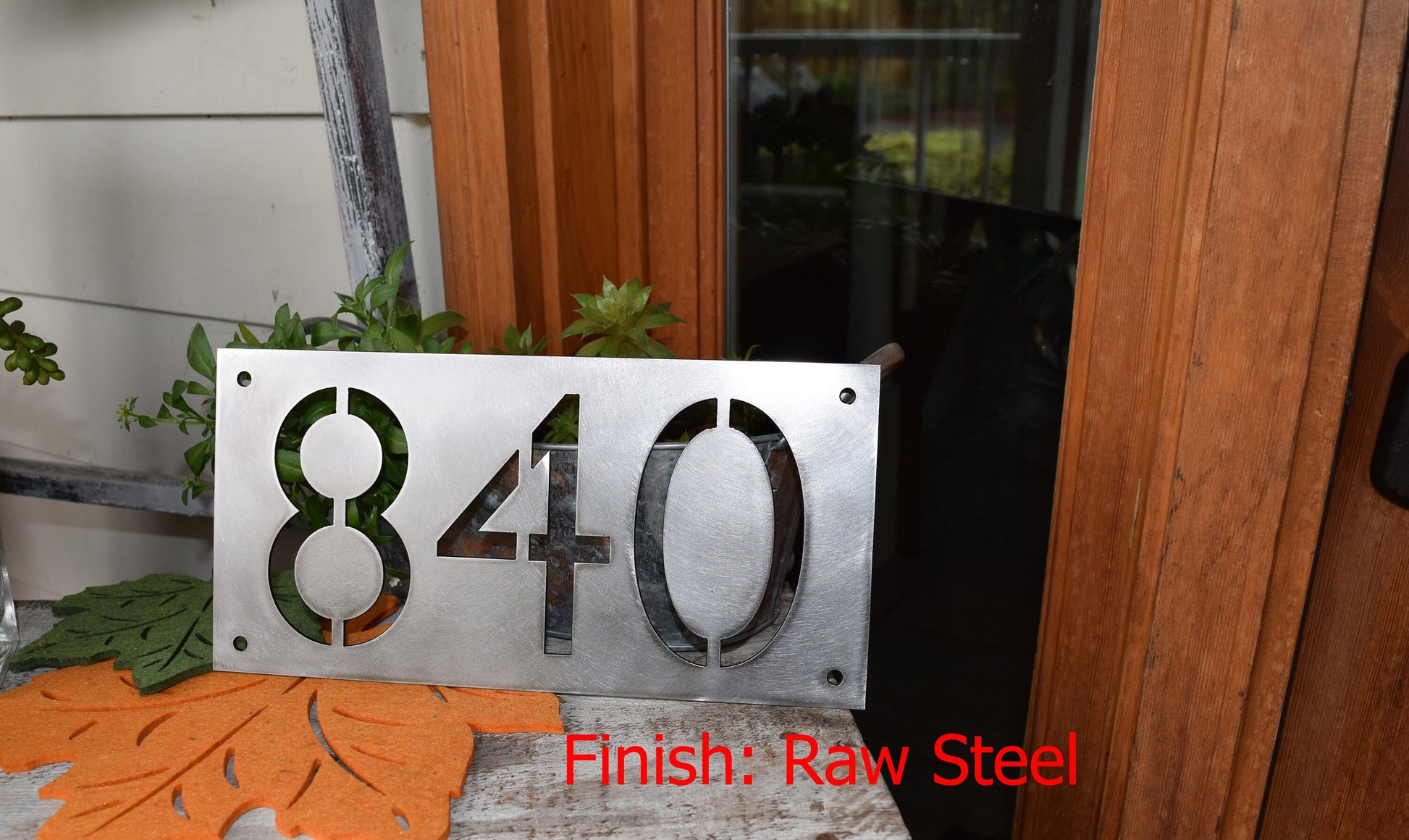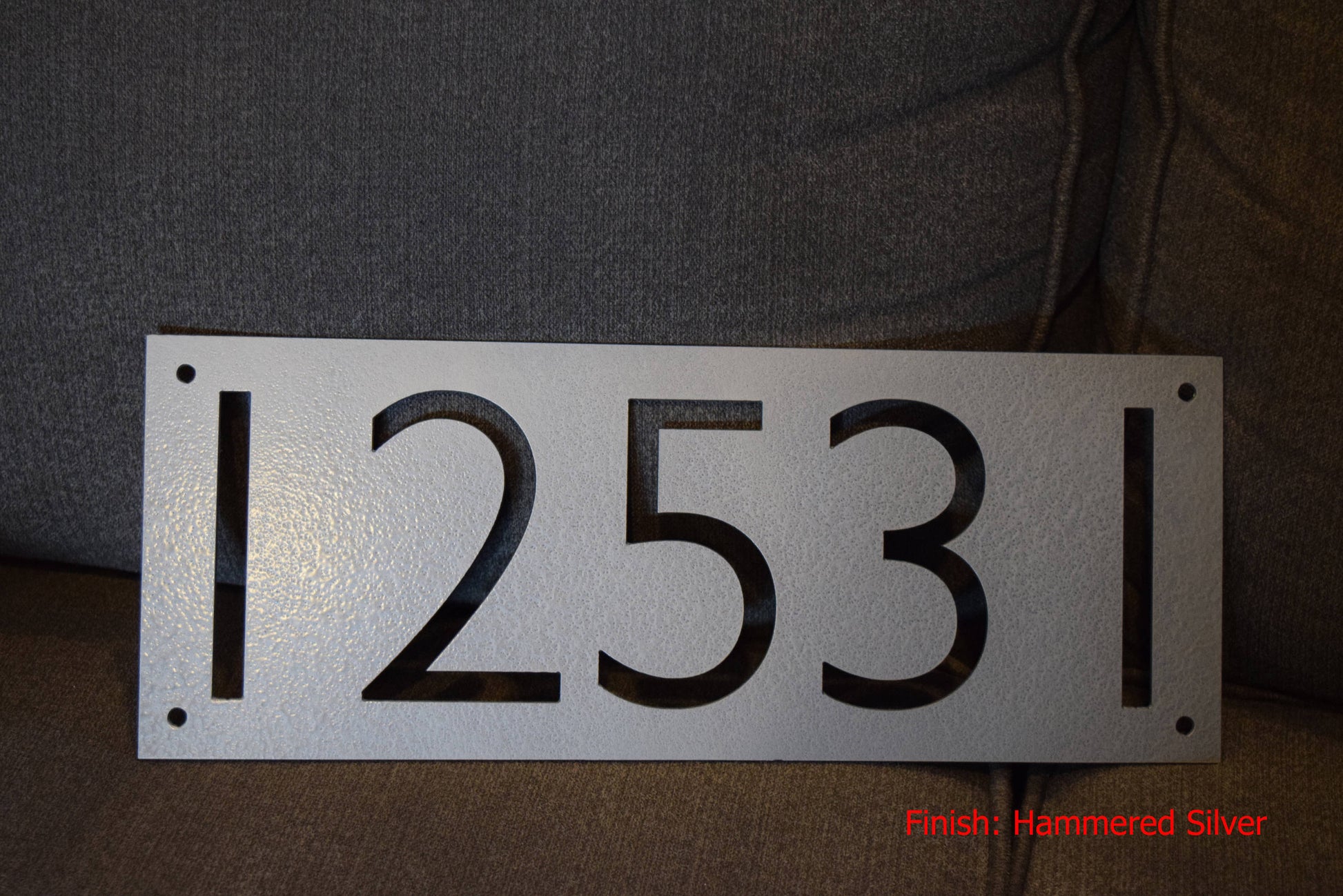 • This is a custom metal address sign. It has pre-cut holes for easy installation and is made from steel. This product is personalized with your own house number and will make a great addition to any front porch or mailbox.