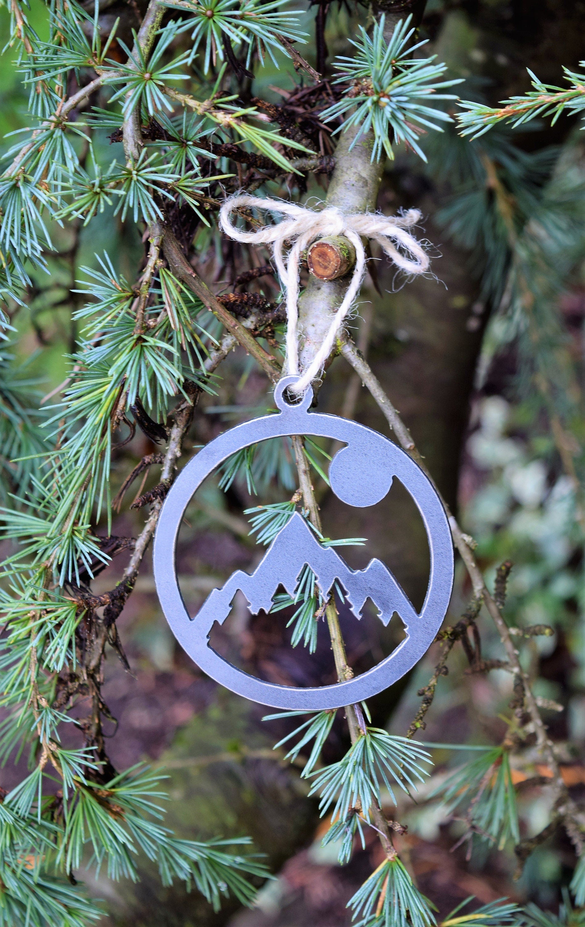 1 Circle Mountain & Sun Ornament approximately 4" H x 3.5" W. The ornament will include ribbon/twine to hang. May vary in color or style from what is shown in the pictures.