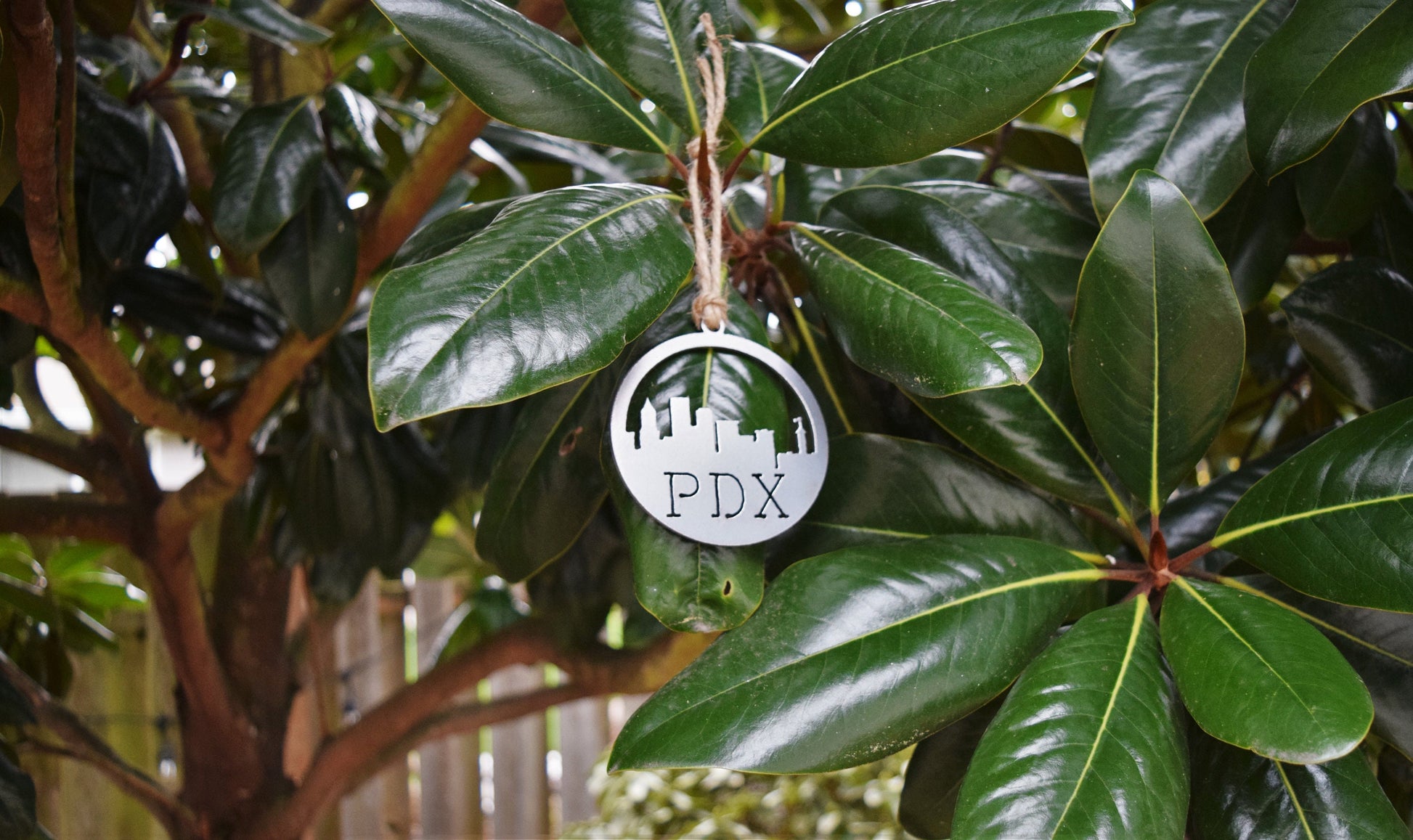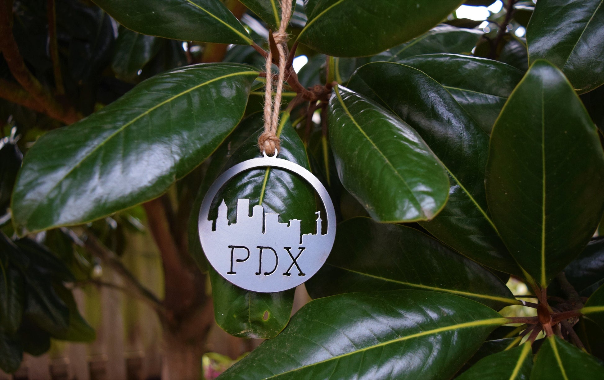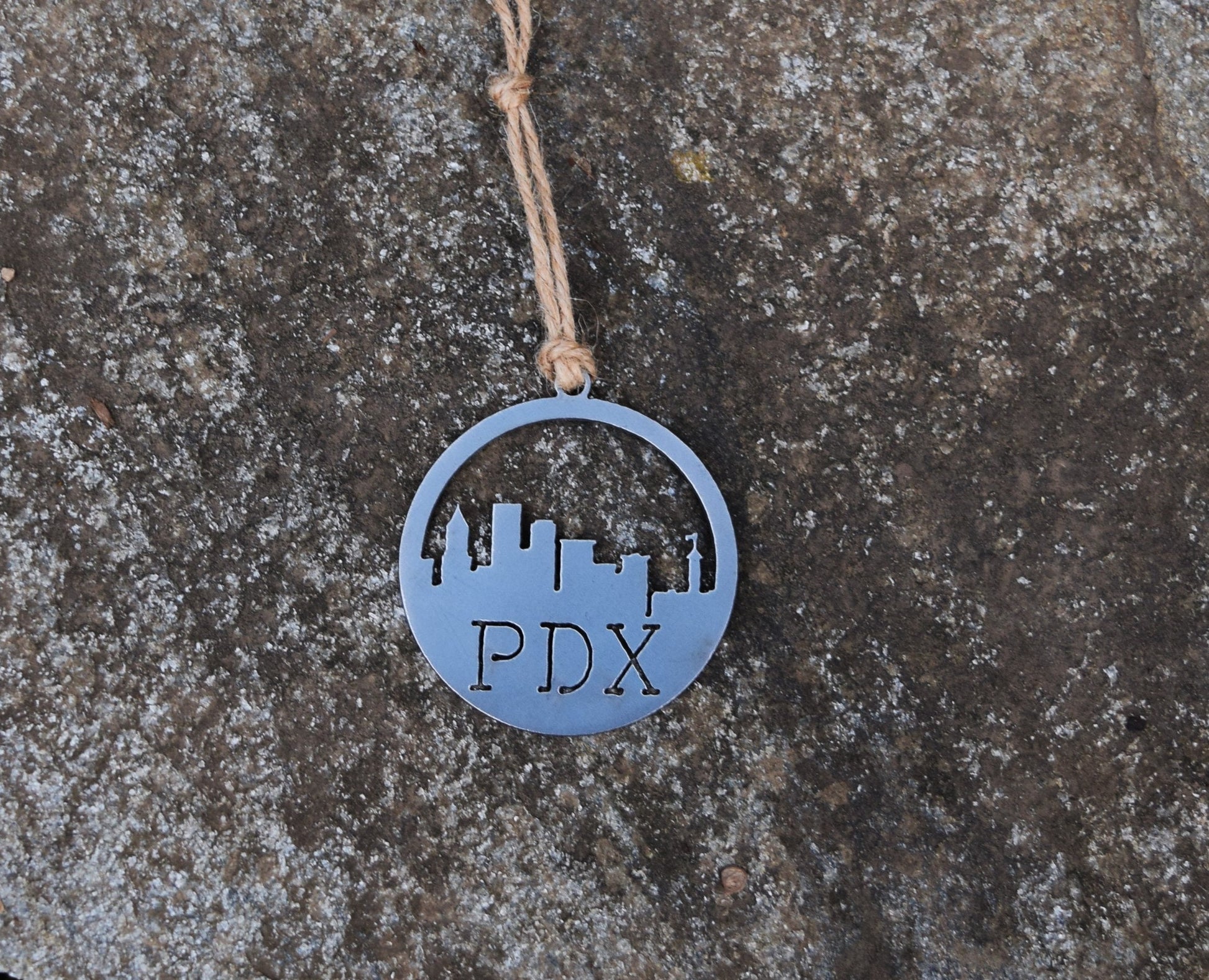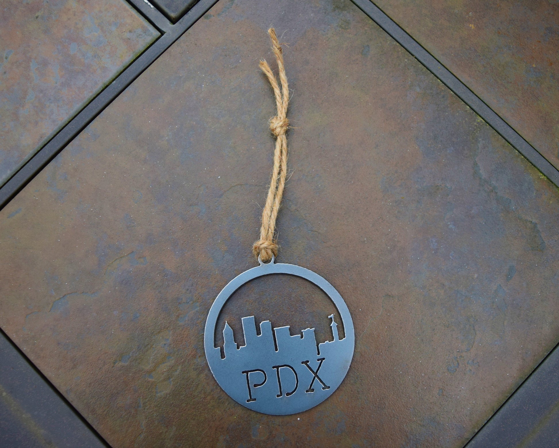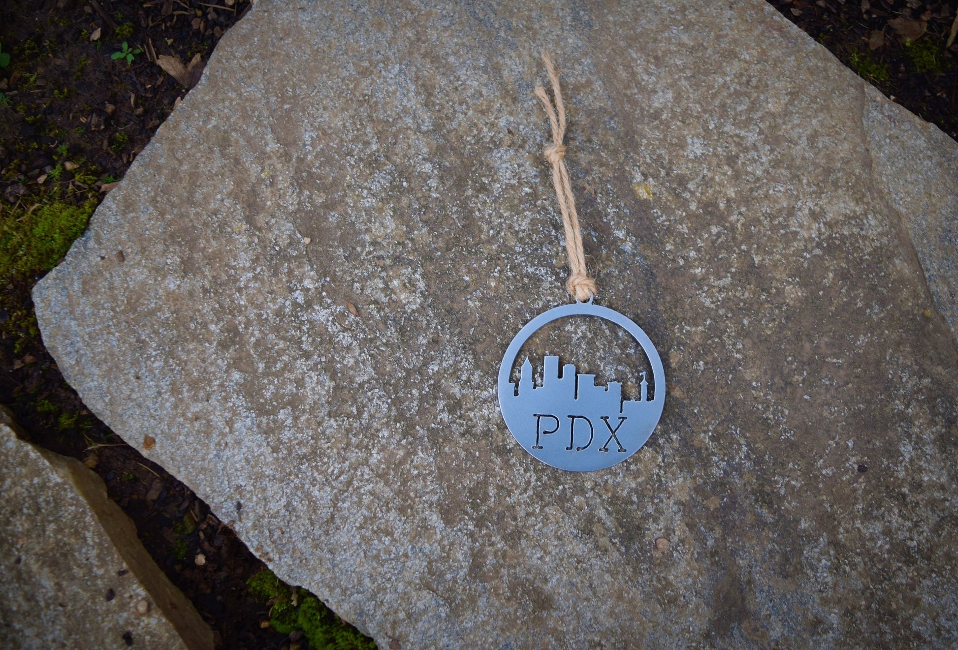 1 - "PDX Skyline" Ornament approximately 4" H x 3.5" W. The ornament will include ribbon/twine to hang. May vary in color or style from what is shown in the pictures.