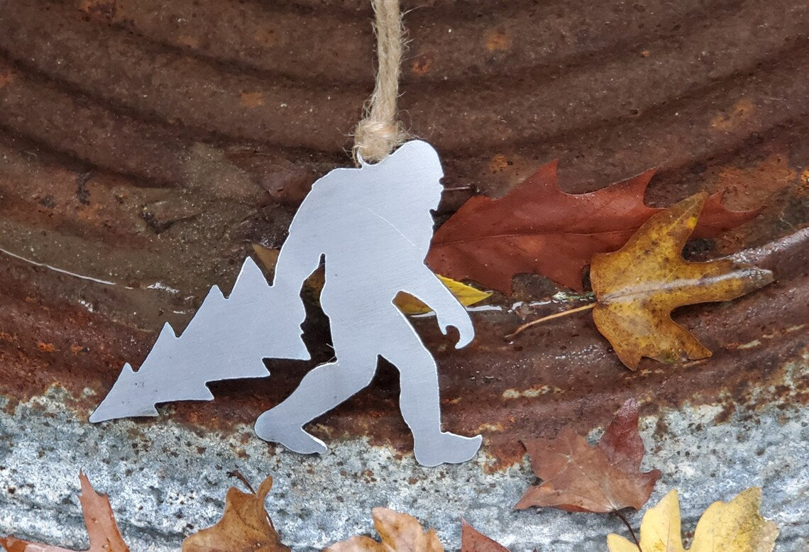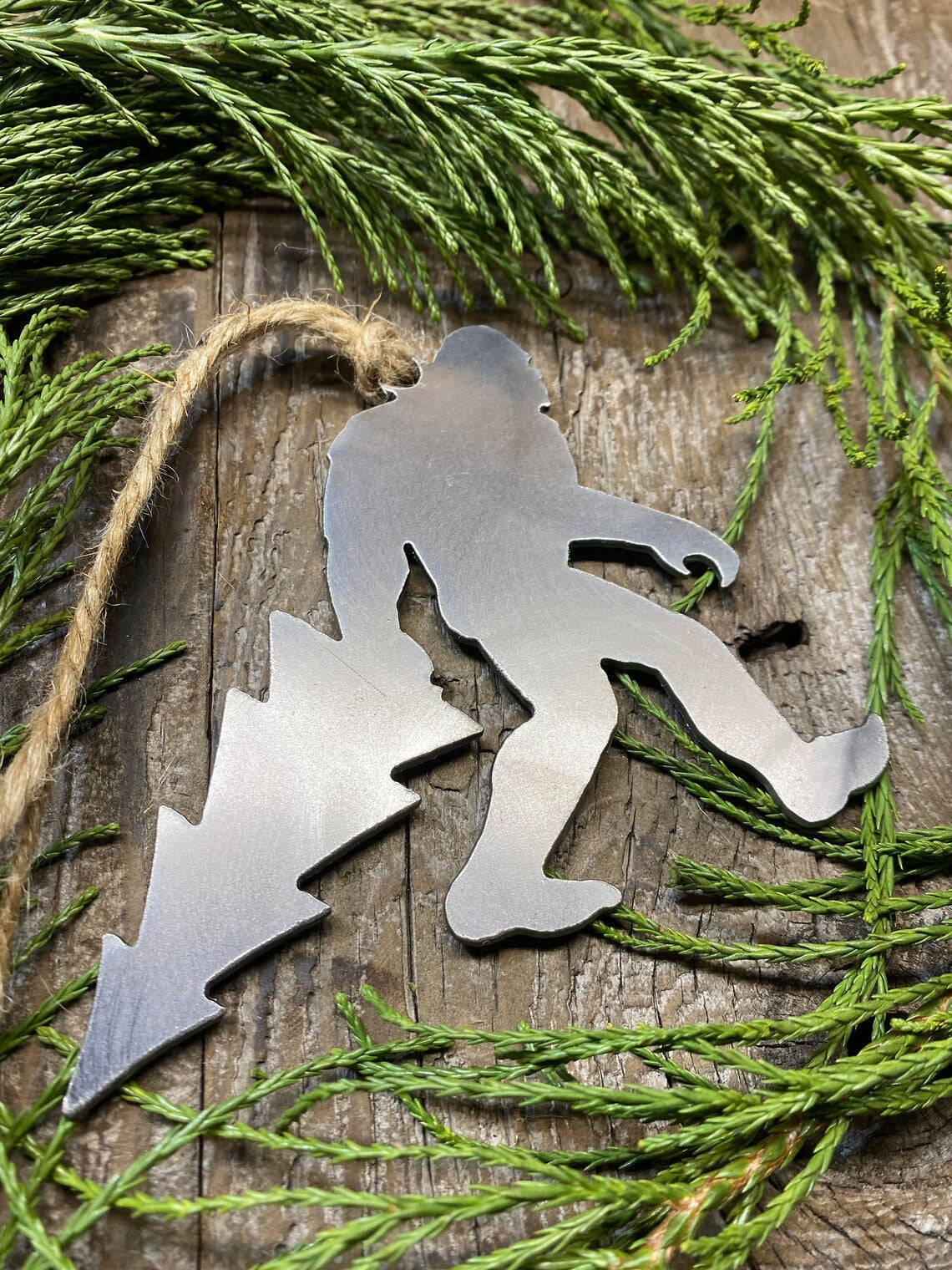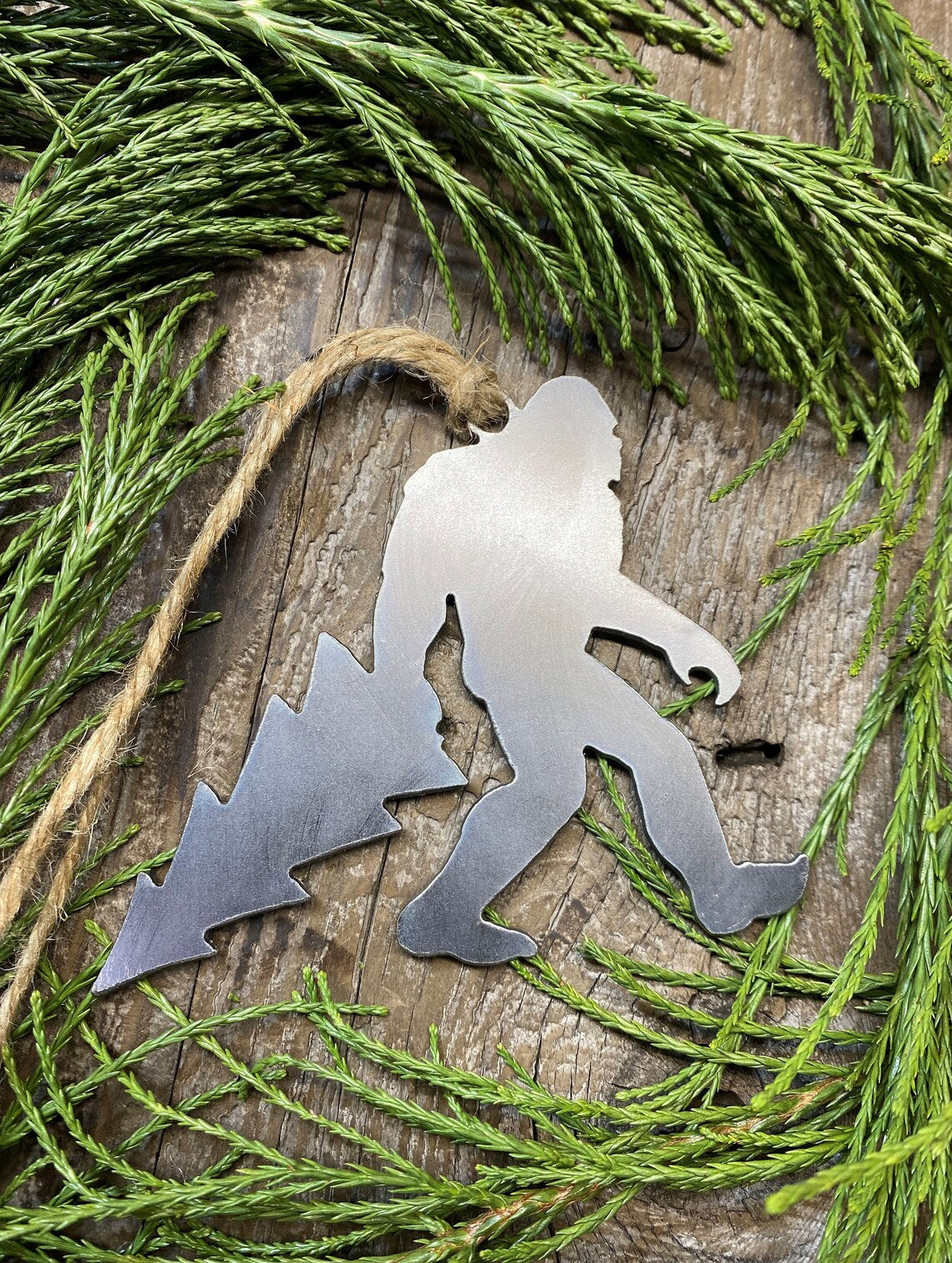 Elevate your holiday décor with our captivating steel sasquatch ornament, seamlessly blending rugged charm with festive whimsy. Crafted with meticulous artistry, this eye-catching masterpiece depicts everyone's favorite cryptid hauling a Christmas tree, adding a touch of enchantment to your seasonal display. Embrace the spirit of adventure and celebrate the yuletide with a modern twist on tradition – because even mythical creatures can't resist the magic of Christmas!