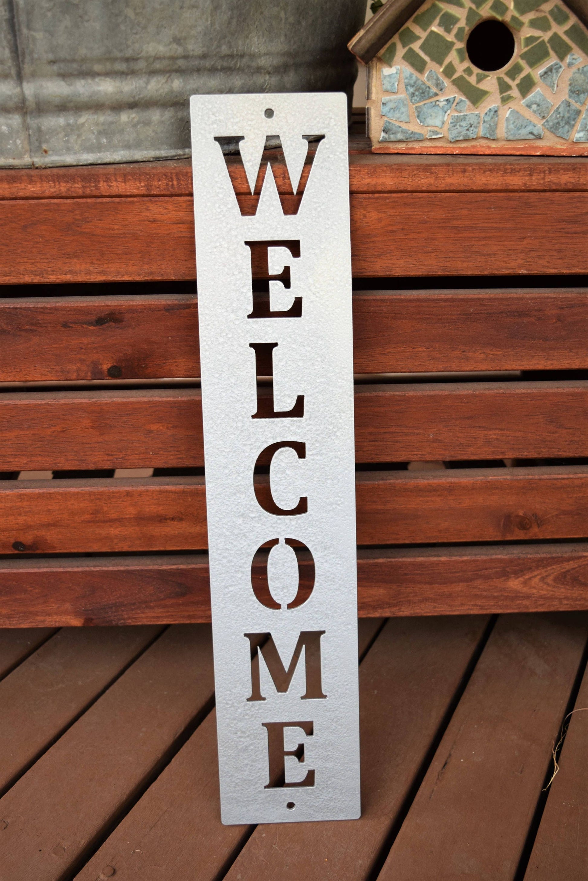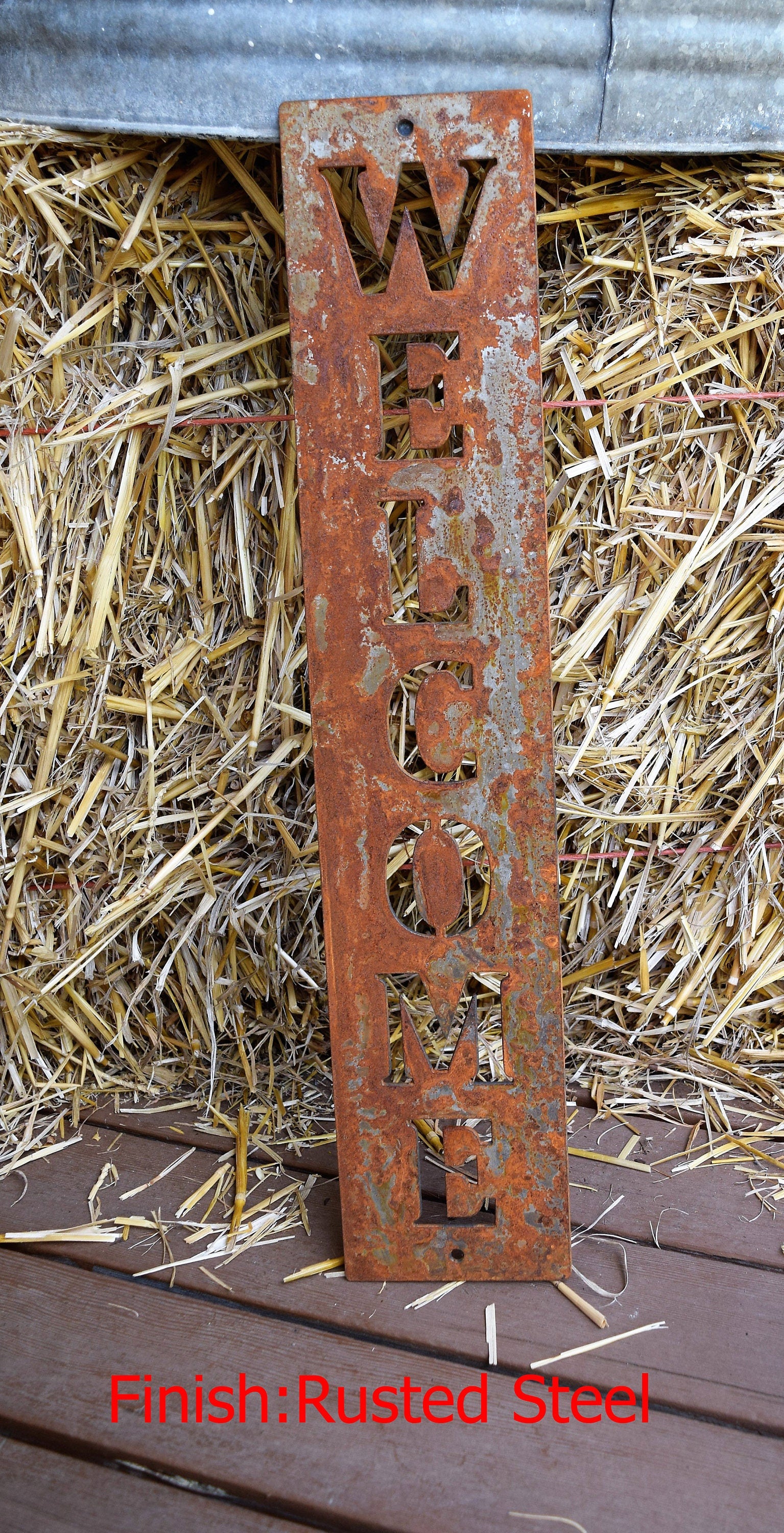 • This is a custom metal "Welcome" sign. It has pre-cut holes for easy installation and made from steel.